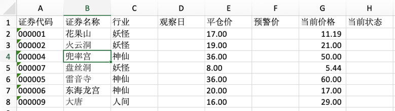 用程序把D列观察日、F列预警价和H列当前状态填上。要求: