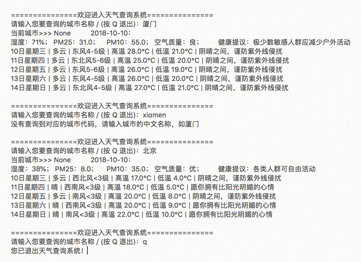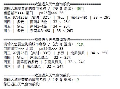 city = input('请输入您要查询的城市名称 / (按 Q 退出):').upper()