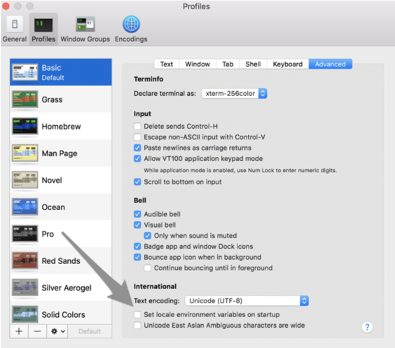 LC_CTYPE是管字符集的,把它的值改成’UTF-8’。打开terminal窗口-> 点击Terminal菜单-> Preferences -> Profile -> Basic的Advanced下有个international -> Text encoding:选择Unicode(UTF-8),Set locale environment variables on start up没勾上的勾上,勾上的取消: