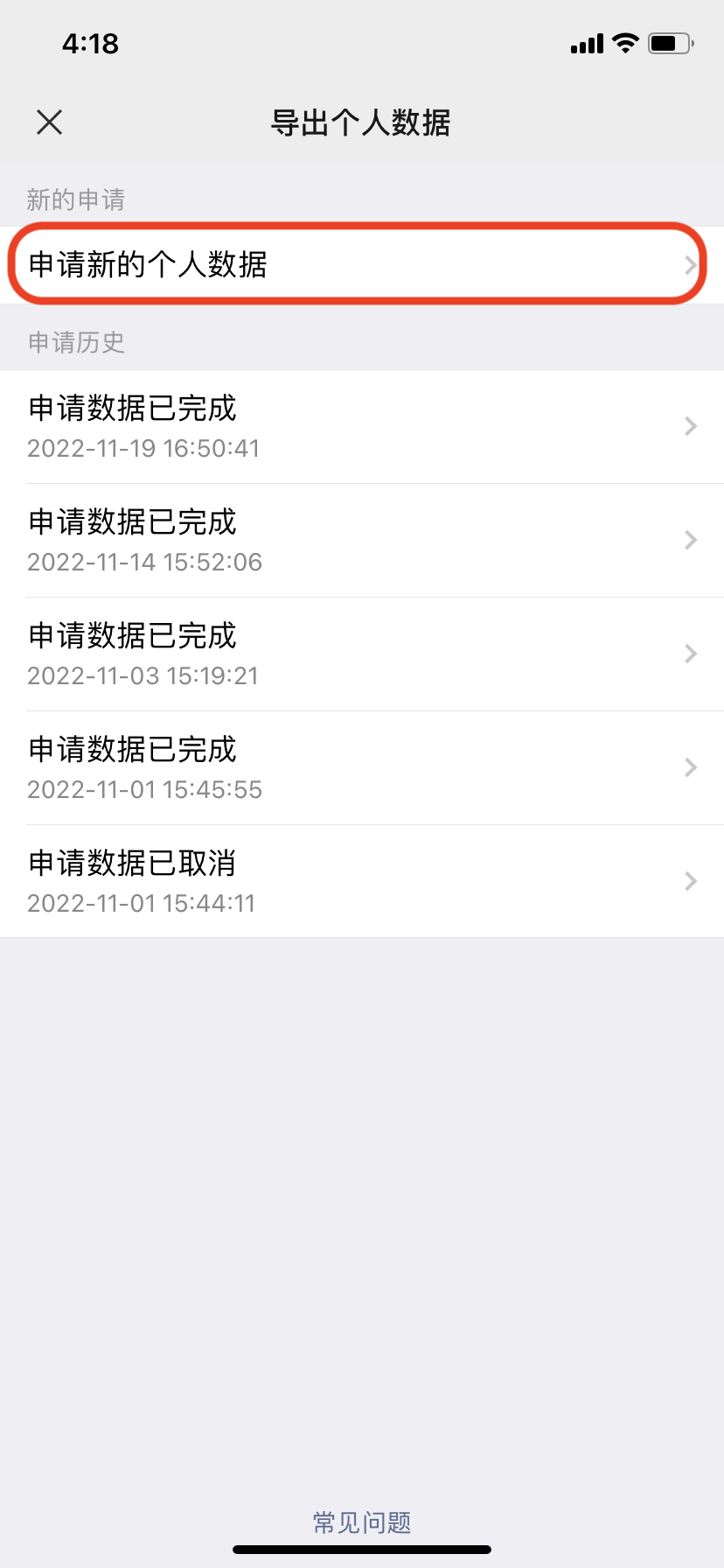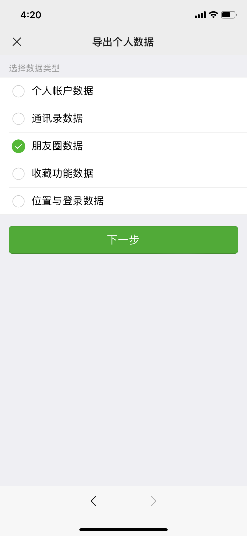 选择要导出那些个人数据,这里我们处理的是朋友圈数据,所以选择“朋友圈数据”: