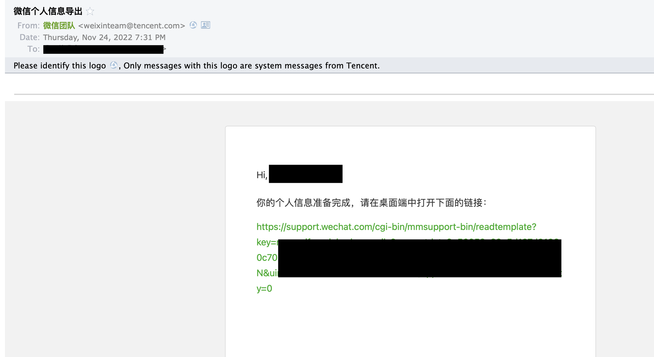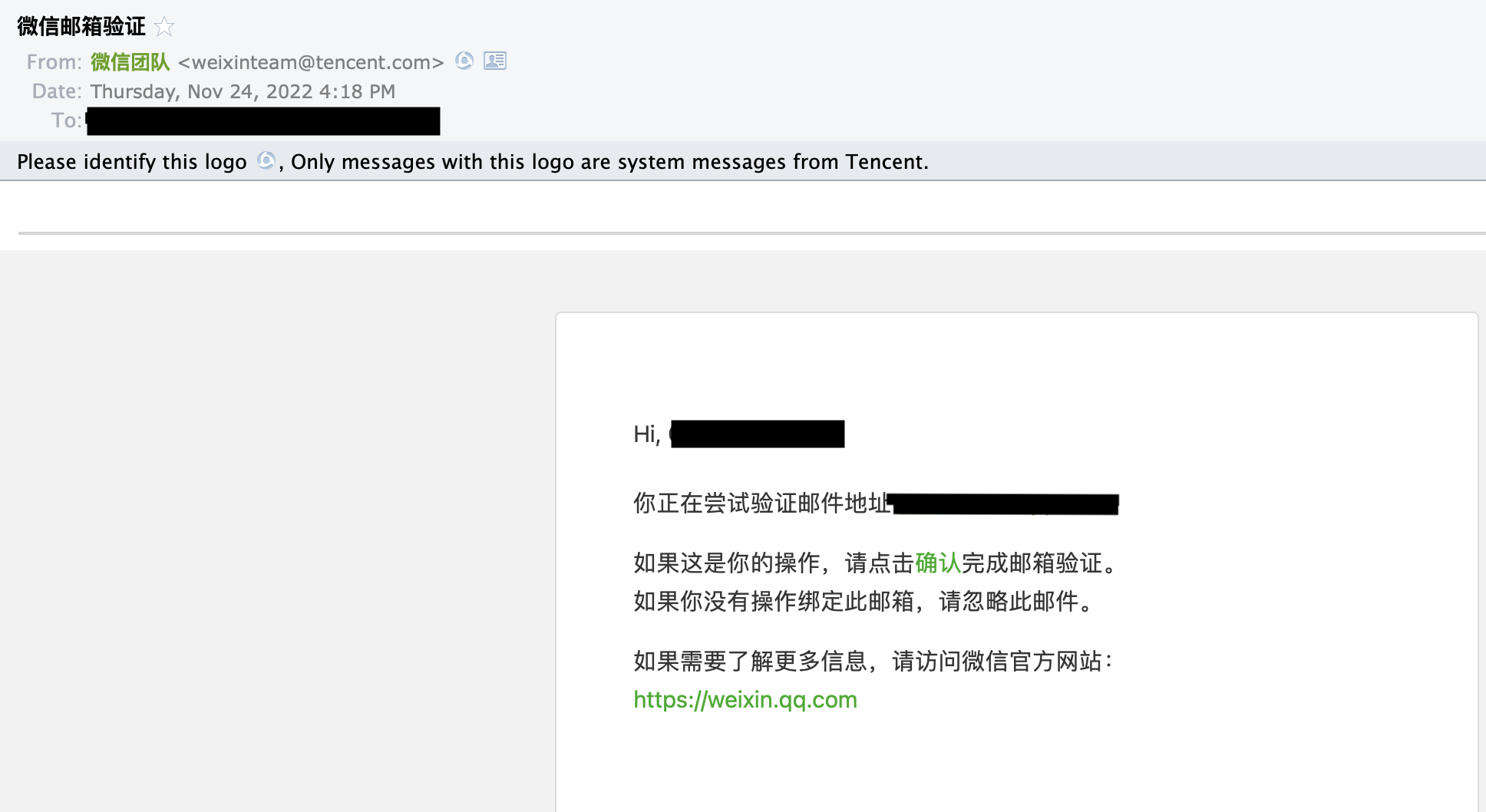 打开您跟微信关联的email,找到微信发来的验证邮件:
