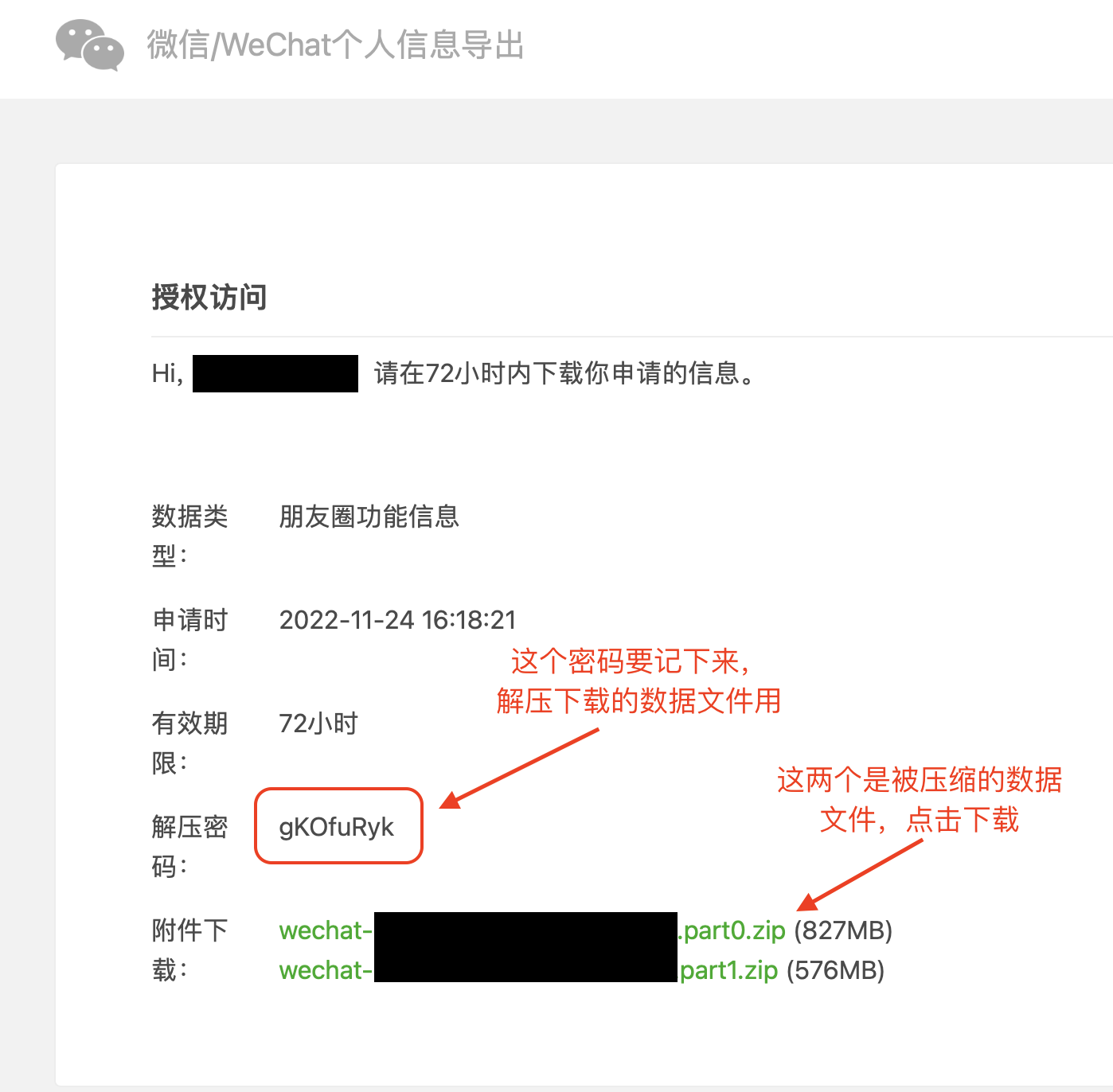 点击下载链接把导出数据下载到本机硬盘,我是放进了一个文件夹内,文件名是下载日期和解压密码: